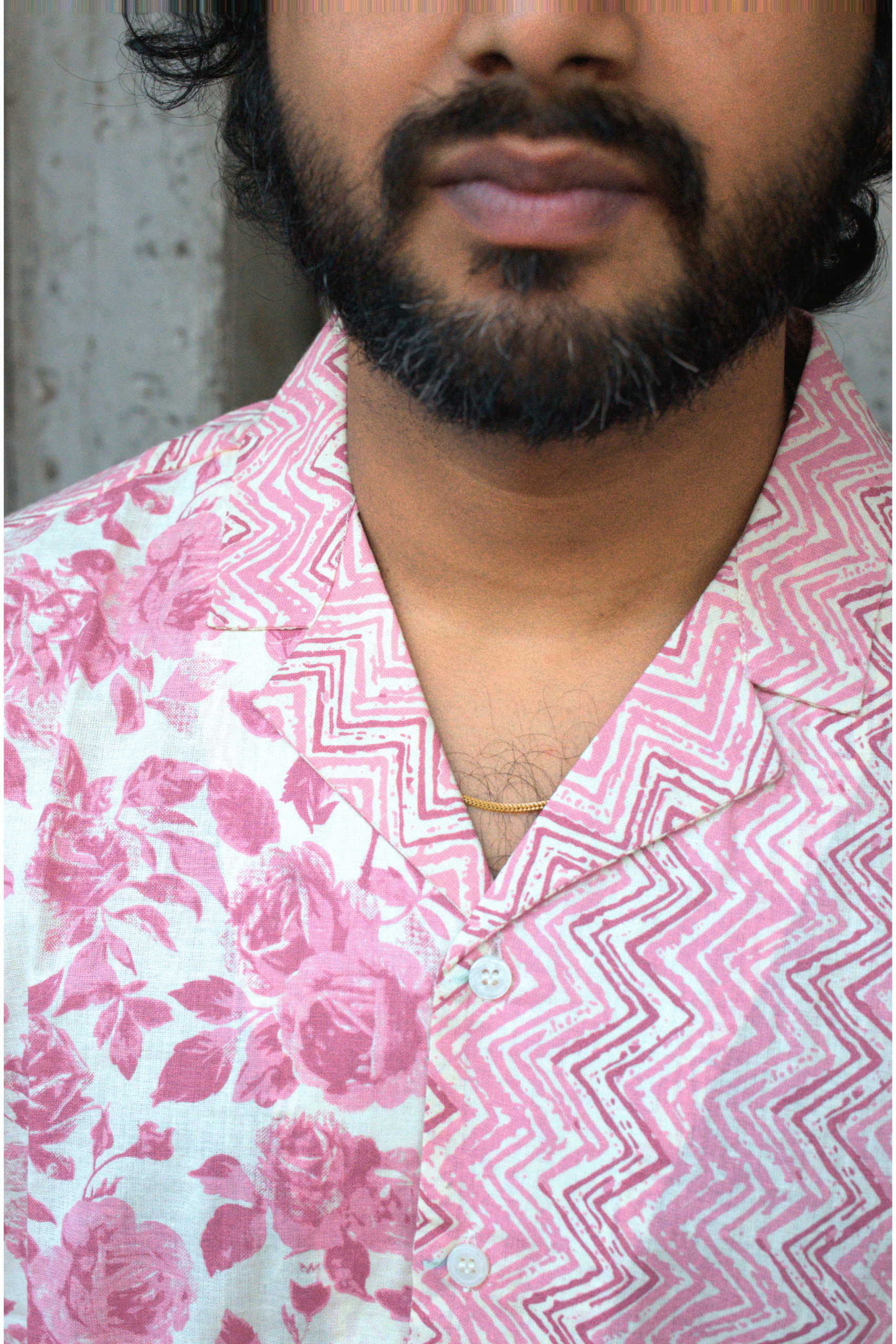 Technical Details: Notch collar, half and half print, cut detailing at the hemline of the shirt, half sleeves